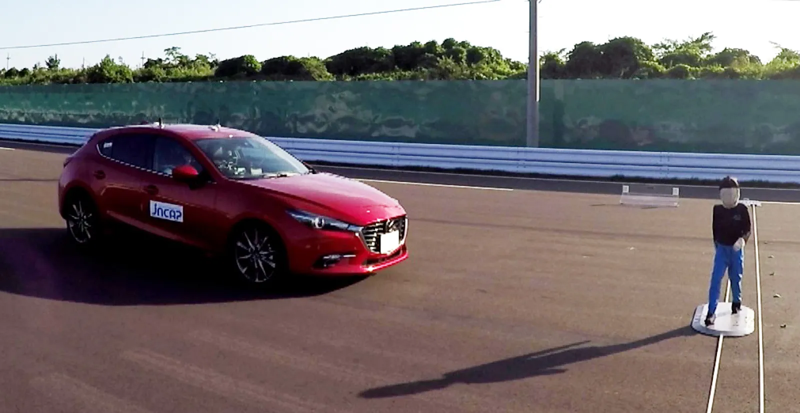 写真は前方歩行者との衝突に対する(昼間)「被害軽減ブレーキ試験」。2018年度からは夜間街灯ありを、2022年からは「衝突被害軽減ブレーキ対自転車性能試験」を試験に追加するなど、常に事故抑止を目指し続けている。