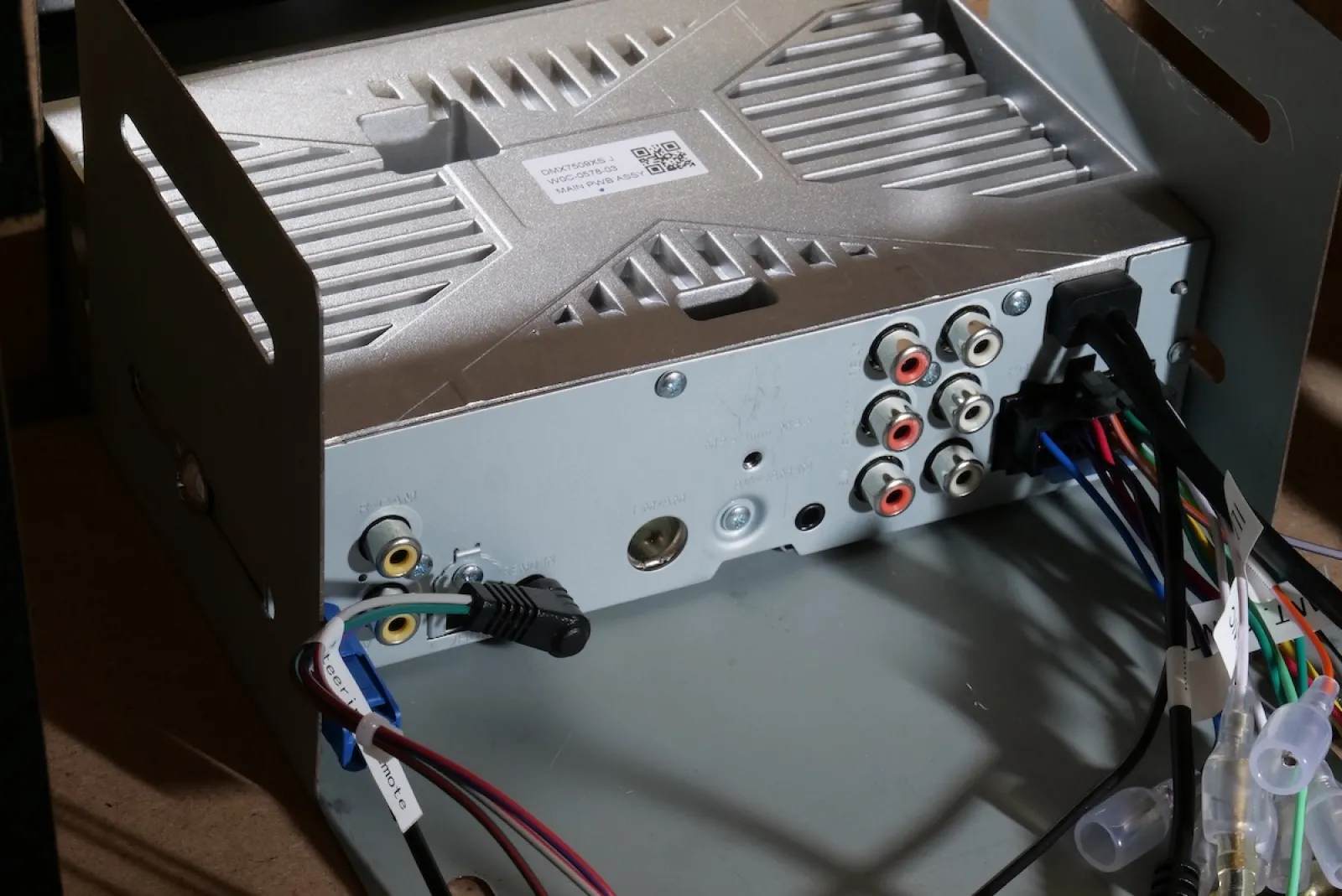 DMX7509XSの背面を除いてみると、確かに1DINサイズ。奥行きもそれほど深くないので、多くのモデルの装着できるはず。ただし、装着可否はモデルごとに販売店で相談を。また6つのAUX端子は4チャンネル+サブウーファー、もしくは3ウエイスピーカーの個別ラインアウトなので、ここからパワーアンプを介したシステムアップも可能だ。