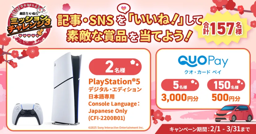 MOBILA内の記事やSNSを「いいね!」していただくと、抽選でPS5®をプレゼント!ほかにも合計157名に賞品GETのチャンス!