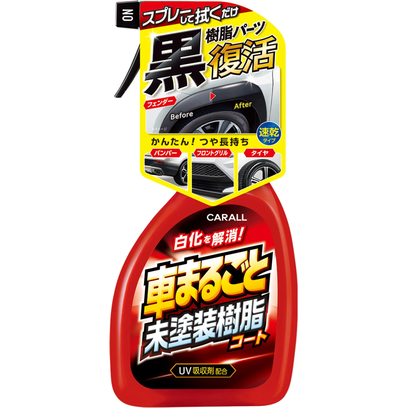 最後に試したのは、利便性の高さで定評のある「車まるごと」シリーズの「車まるごと未塗装樹脂コート」だ。近年のSUVブームもあり、フェンダーやバンパー、ピラーなどの未塗装樹脂パーツのメンテナンス需要は高まっている。これらパーツが白く退色してしまうと、どんなにボディが輝いていても車全体の印象がボケてしまう。