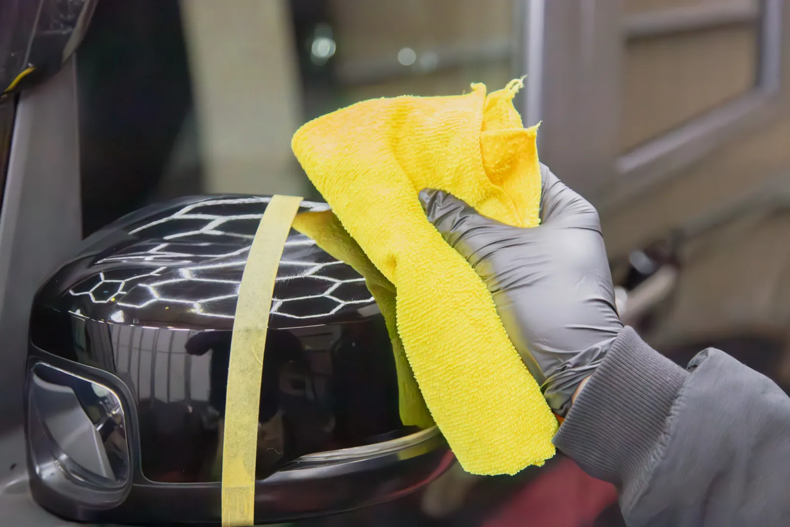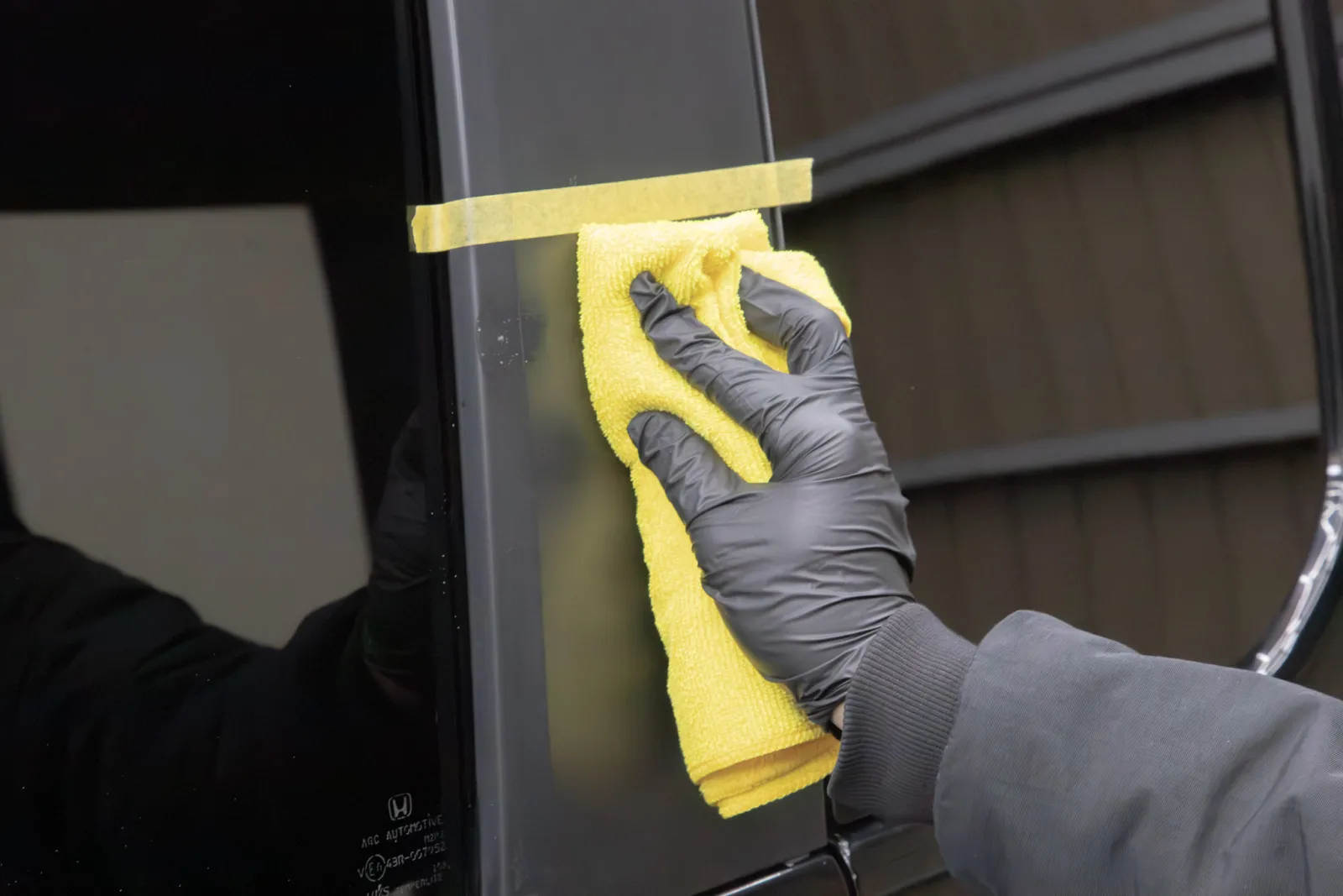 クロスに液剤をスプレーして使用する。ドアミラーの水アカをサッパリ一掃