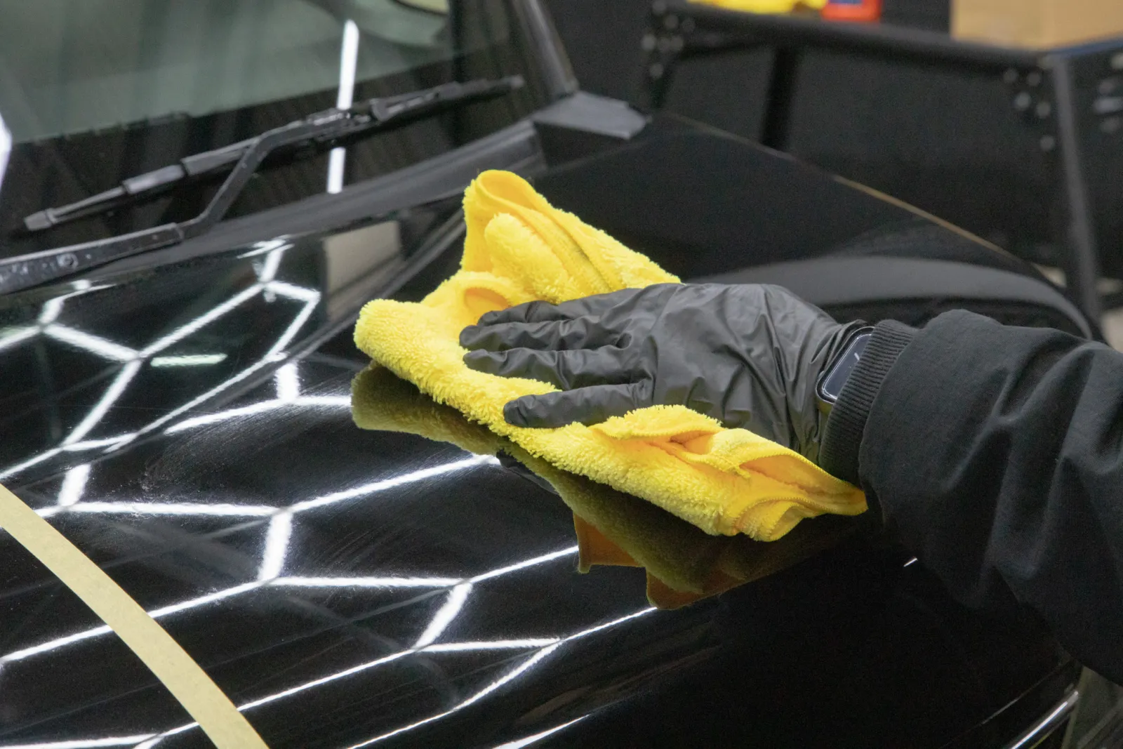 清潔なマイクロファイバークロスなどで拭き上げる。ムラになりにくく非常に施工しやすかった。 ボンネットで確認した驚愕の「境界線」