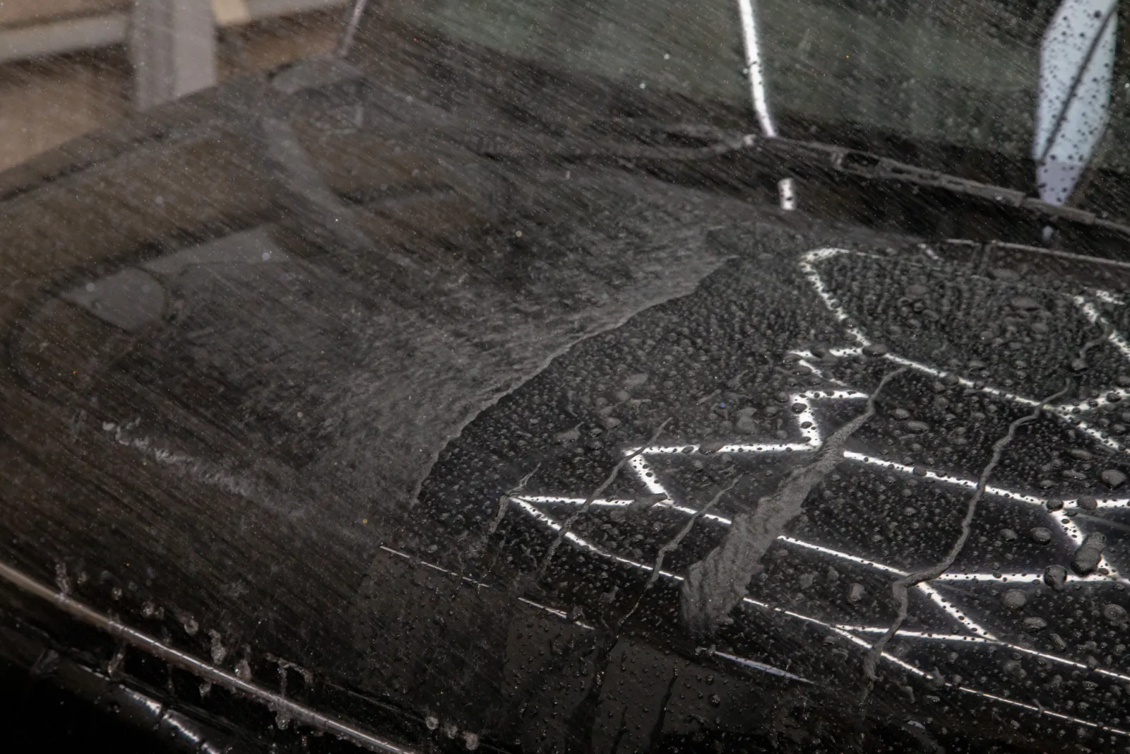施工は非常に簡単だ。洗車後の濡れたボディ、あるいは乾いたボディにスプレーして拭き上げるだけである。今回は効果を可視化するため、ボンネットをマスキングテープで左右に分割し、片面のみに施工を行った。ボディにスプレーし拭き上げた瞬間から施工した側のボディには深い艶が宿る。まるで色が一段階濃くなったような、セラミック特有のしっとりとした光沢だ。そして、最も驚かされたのは散水テストの結果である。未施工側は水がベタっと膜のように広がるのに対し、施工側は水をかけた瞬間に「バチバチ」と水玉が弾け飛ぶ。水滴が球体に近い状態で転がり落ちる接触角度が高めの強撥水だ。
