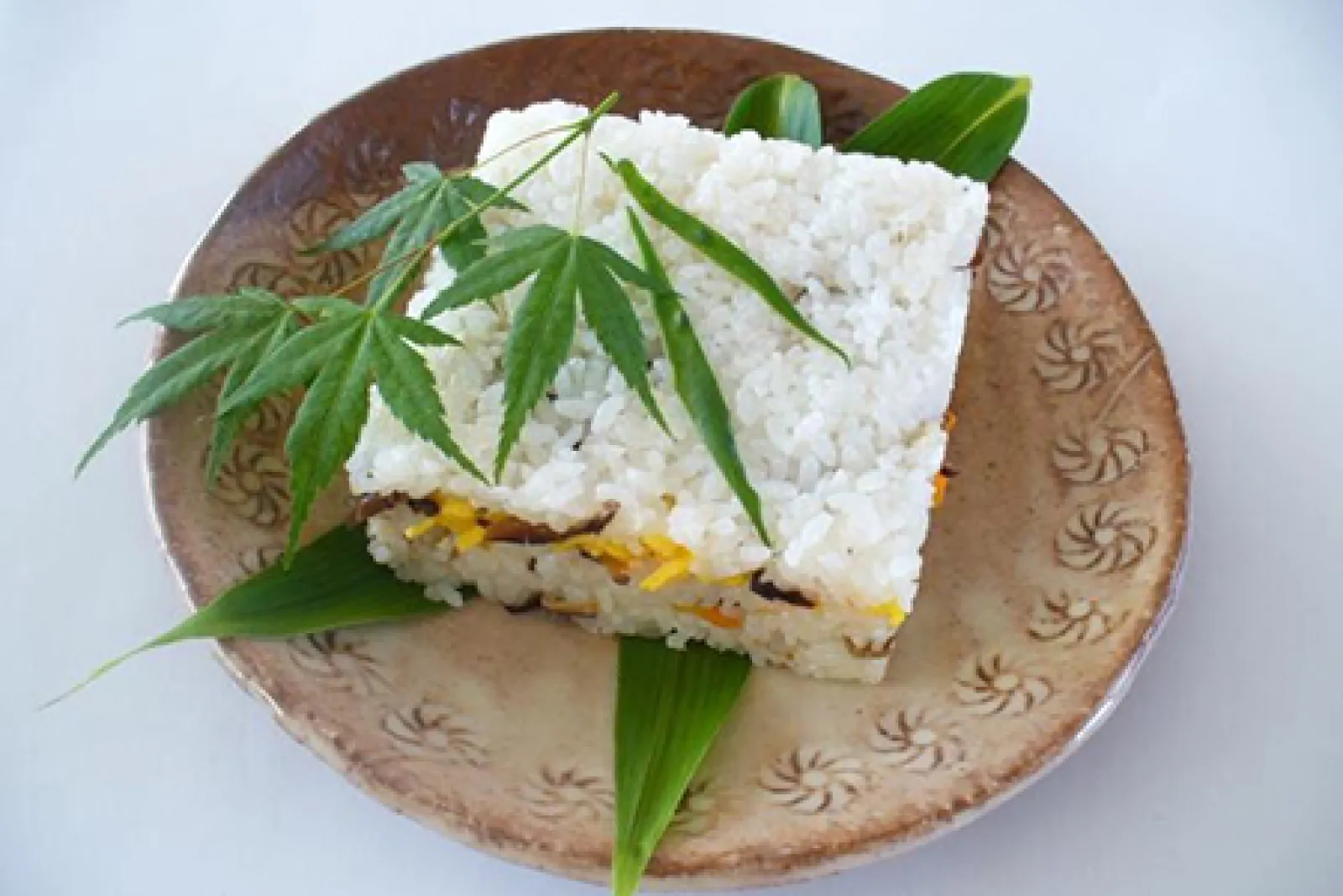 寿司には具が一切なく、真っ白い見た目と、具が消えたという表現からゆうれい寿司と呼ばれ、吉部地区の伝統料理として伝承されてきました。現代では酢飯にエソのミンチ(白色)を混ぜ込み、魚介のうま味と風味を加えたものを使用。さらに押し寿司を2層とし、上段に白い酢飯、下層に吉部地区の季節の山菜等を混ぜた酢飯とすることで、外観は白いまま、山海の風味溢れる「おいしいゆうれい」にアレンジされています。