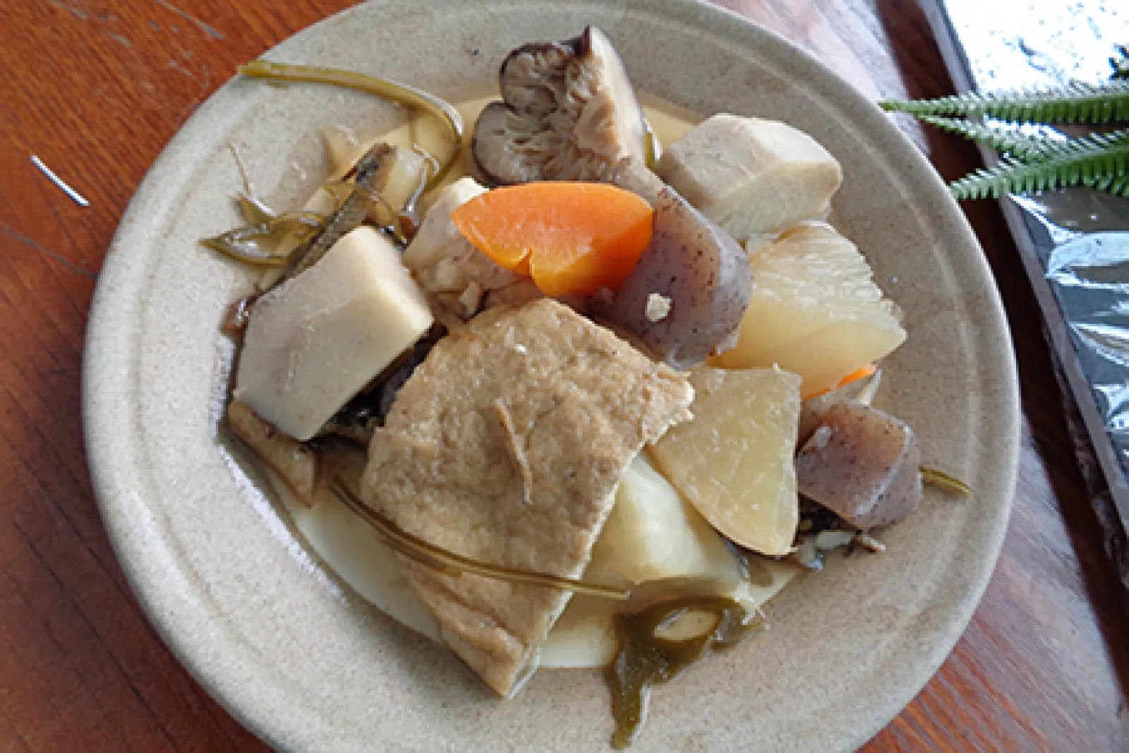 大きな鍋に切った大根、ごぼう、にんじん、こんにゃく、里芋を順に入れ、上に煮干しをのせ水を注ぎ煮ます。堅い野菜に火が通ったらしょうゆで味付けし、豆腐、油揚げ、糸昆布をのせ、弱火でさらにじっくり煮込みます。大晦日には、この煮物とお頭つきの魚としてメザシ(鰯の干したもの)がつきました。