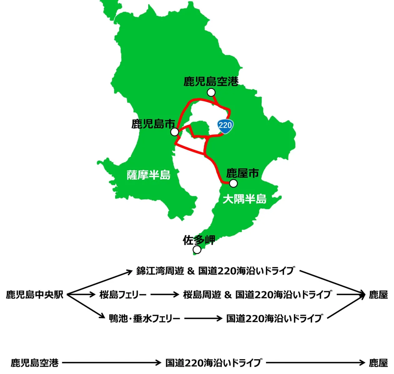 なお公共交通機関の場合、駅からはバス、フェリーを乗り継ぎ、空港からは直行バスになります。ただ、鹿屋市内は電車がないので市内の移動で不便を感じるかもしれません。