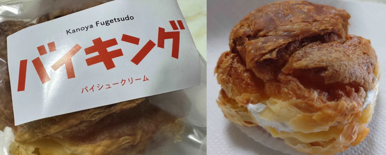 菓乃家(かのや) 風月堂は和菓子・洋菓子を扱う老舗のお菓子店。そこの「バイキング」を見て、まず驚くのは外観のインパクト!ガッシリと大きく膨らみ、しっかり焼きあがったパイ生地のパフ。そのパフの間からは、はみ出さんばかりに詰まった生クリームとカスタードクリームが垣間見えます。口に入れる前から美味しさを確信しつつ「さぁ、最初の一口」。どれほど大きく口を開けても足りないほどの大きさ。そして一口かじると“パリパリッ”とパイ生地が口の中ではじけ、豊富なバターの香ばしい風味が口の中いっぱいに広がります。すると今度は2つクリームがやってきてパイ生地の風味と混ざり合います。パイ生地と2つのクリームが織りなすハーモニーを味わい、その後の余韻に浸る間も含め、至福の時でしかありません。バイキングにかぶりつく姿をはたから見るとハンバーガーに食らいつくかのよう。それほど大きいのですが、食べ終えると「もう一個食べたい・・・」と心の声がつぶやいています。1個370円。これだけの大きさ、そして美味しさを考えるとコスパも十分。お店の方にバイキングについて聞くと「普通ですよ」とおっしゃっていましたが、私には鹿屋を代表する特別な逸品です!