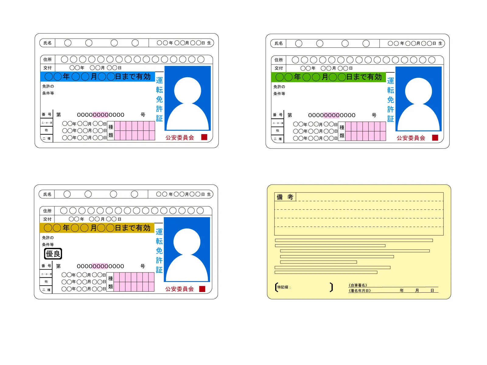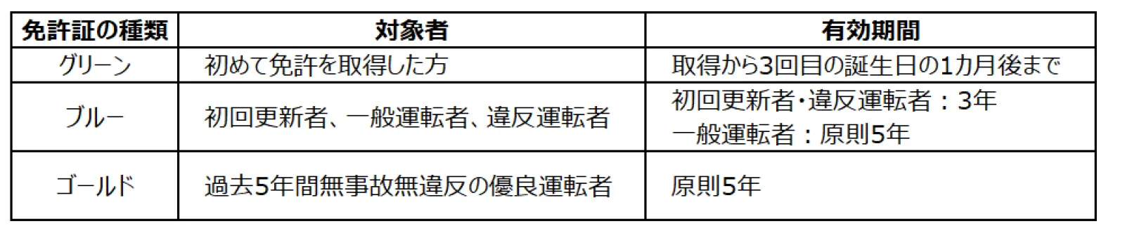 免許証の有効期間は、種類によって以下のように異なります。