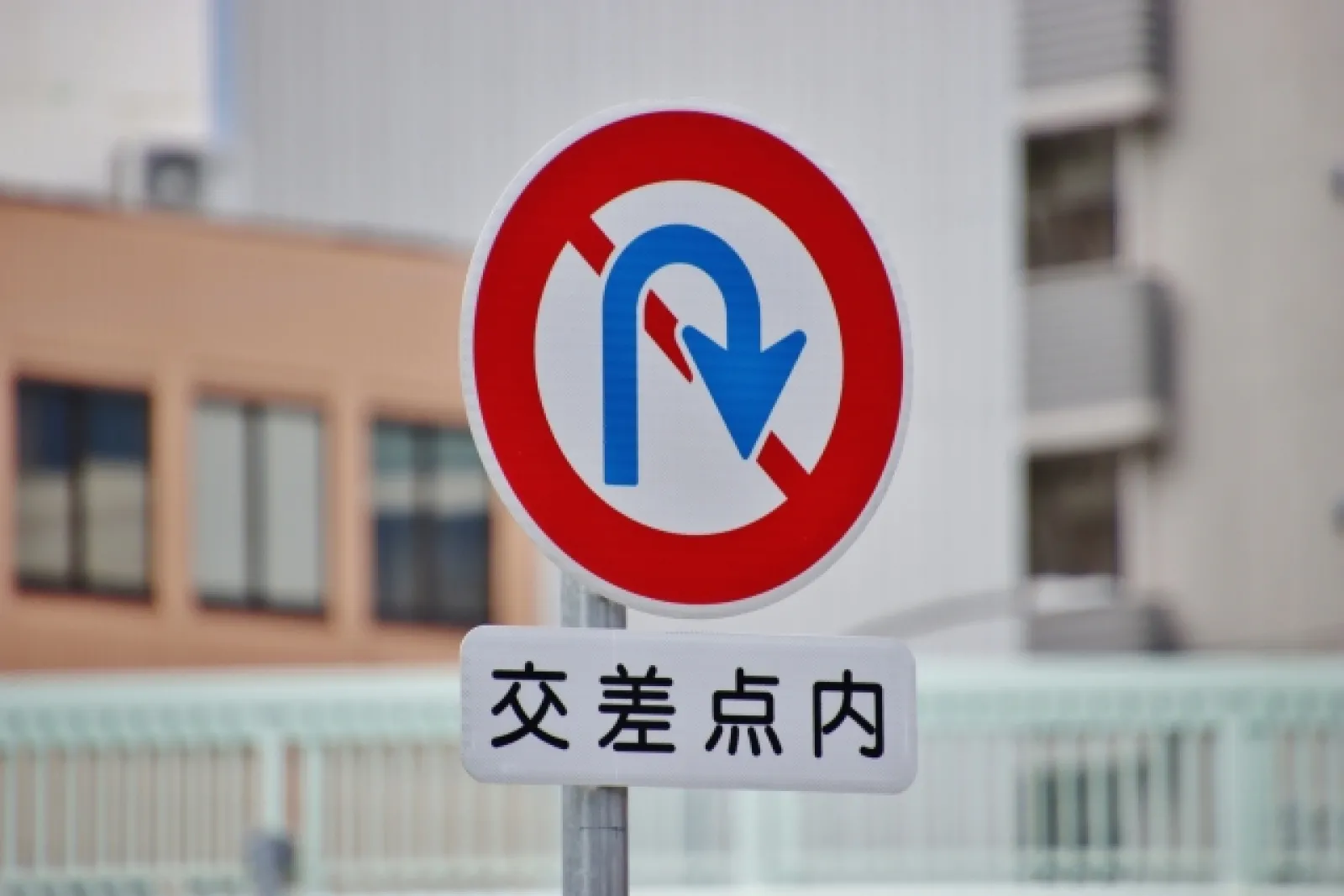 Uターン禁止の標識は丸い枠の中に青いUターンの矢印、その上に赤い斜線が入ったものです。この標識が設置されている交差点や道路では、転回は禁止されています。