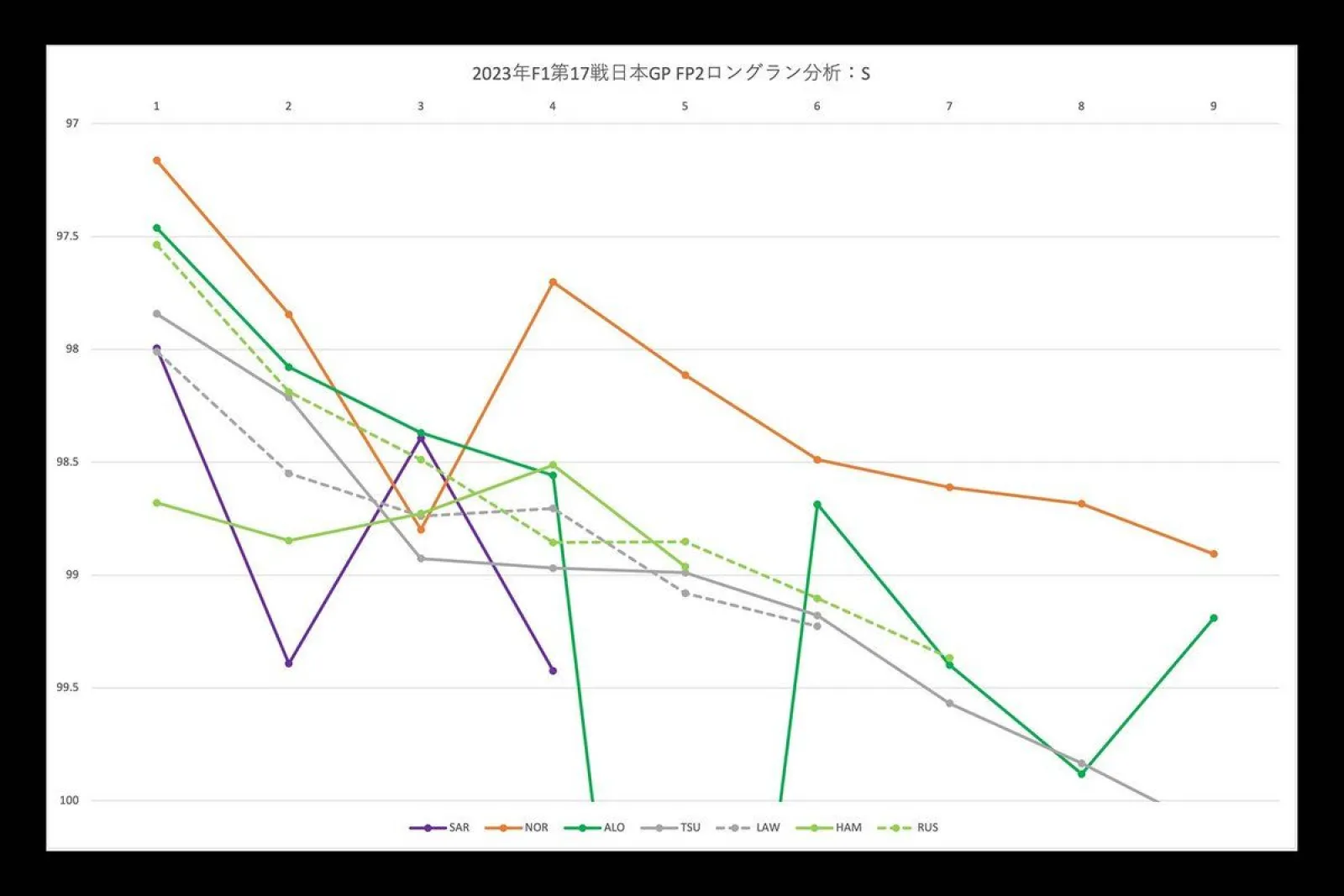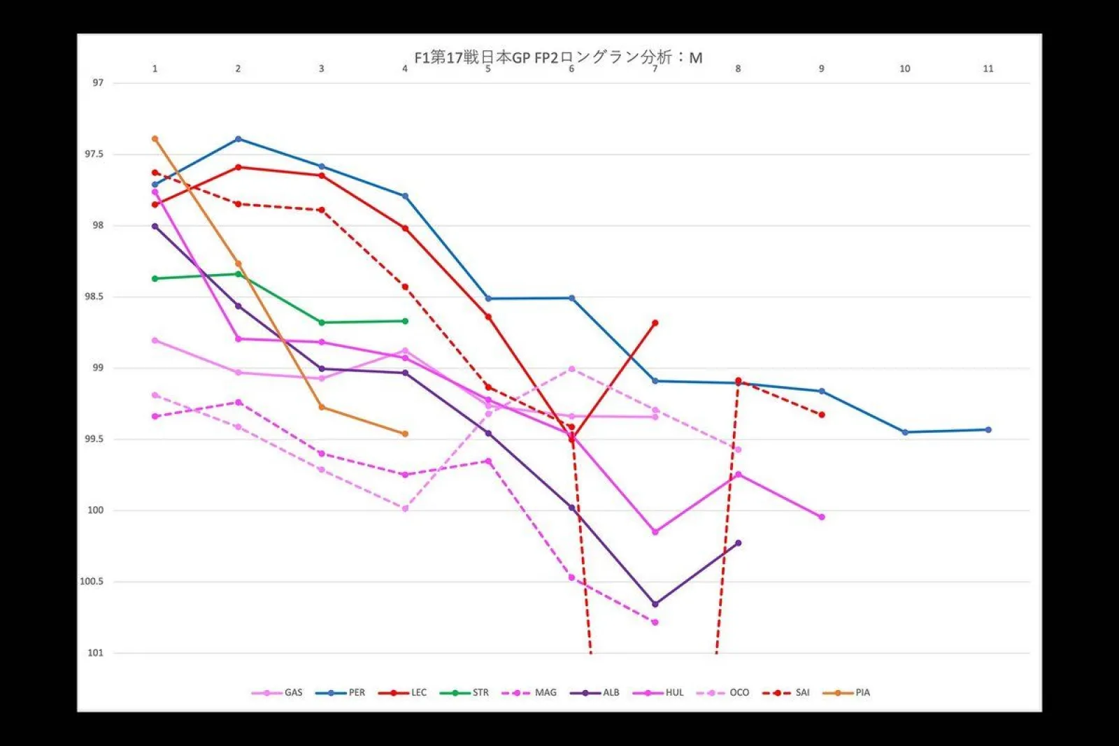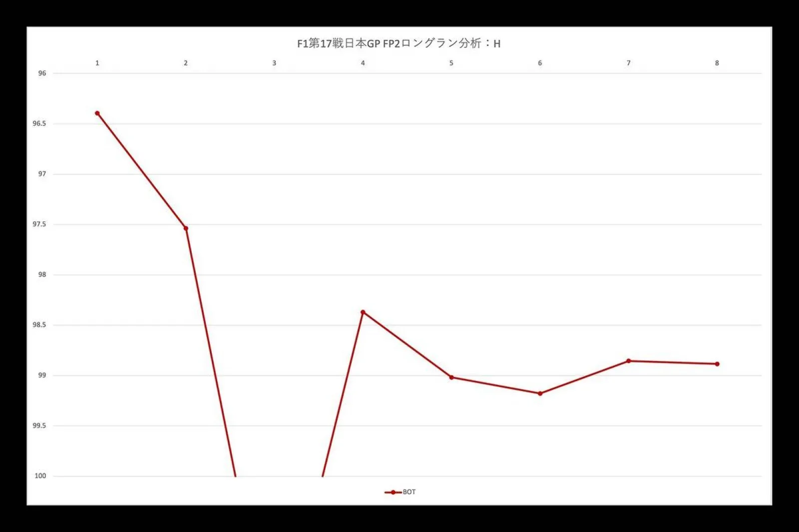 上のグラフは、ソフトタイヤでの各車のロングランペースである。いずれのグラフも右肩下がりとなっている。つまり走行距離がかさむに連れて、ペースが悪化していっているということが顕著に現れているのだ。