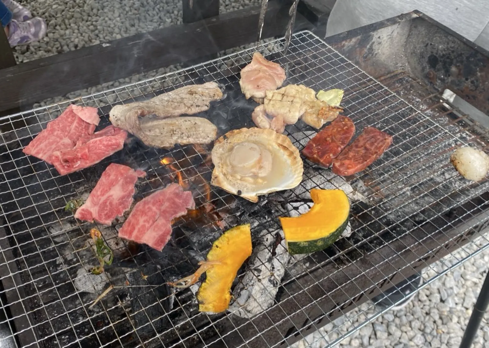 そして楽しみにしていたBBQ! 炭火で焼いた鶏肉とかぼちゃが最高に美味しかったです。 昼間からは暑すぎるくらいの気候で汗かきながら焼き番しました。